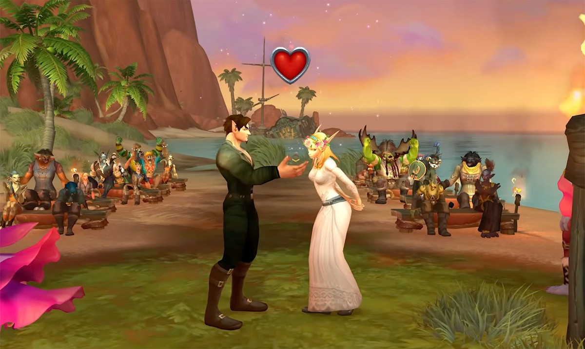 На отметке 0:51 в ролике показана группа гостей, собравшихся на спокойном пляже на закате, с волнами, набегающими на берег. В центре – деревянная арка, увитая плющом, где жрец-таурен, судя по всему, проводит свадебную церемонию между двумя эльфами. Пара обменивается очень большим кольцом, толпа аплодирует, а в воздух взмывают фейерверки, образующие сверкающие розовые сердца.