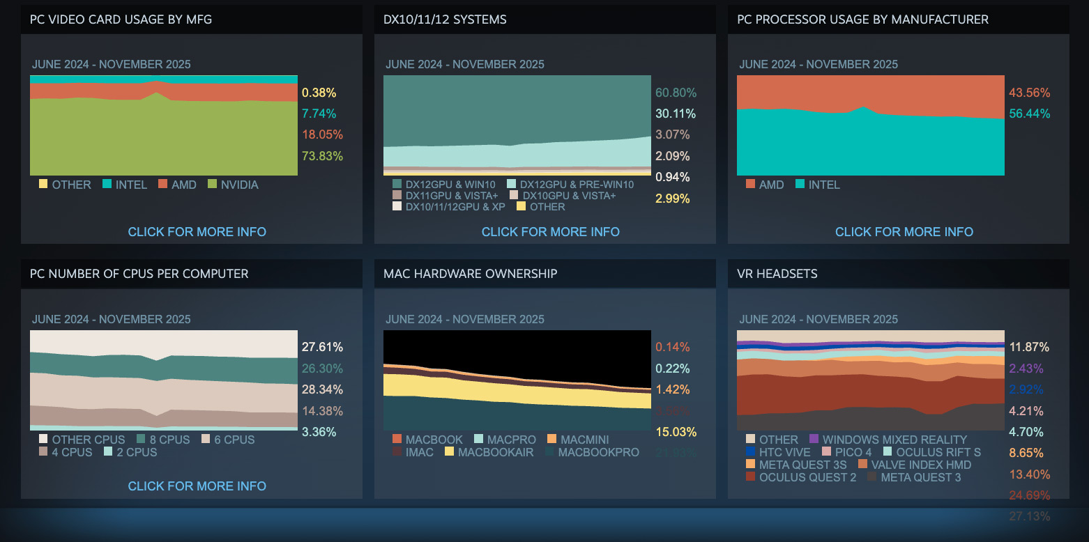 На фронте железа AMD продолжает наступление на Intel. Красные контролируют уже 43,56% рынка игровых процессоров против 56,44% у синих. За исключением одного месяца, доля Intel стабильно снижается почти год подряд. За последний месяц процессоры с восемью и более физическими ядрами показали совокупный рост на 1,18%, что указывает на активное обновление систем геймерами – вероятно, в пользу платформы AMD.