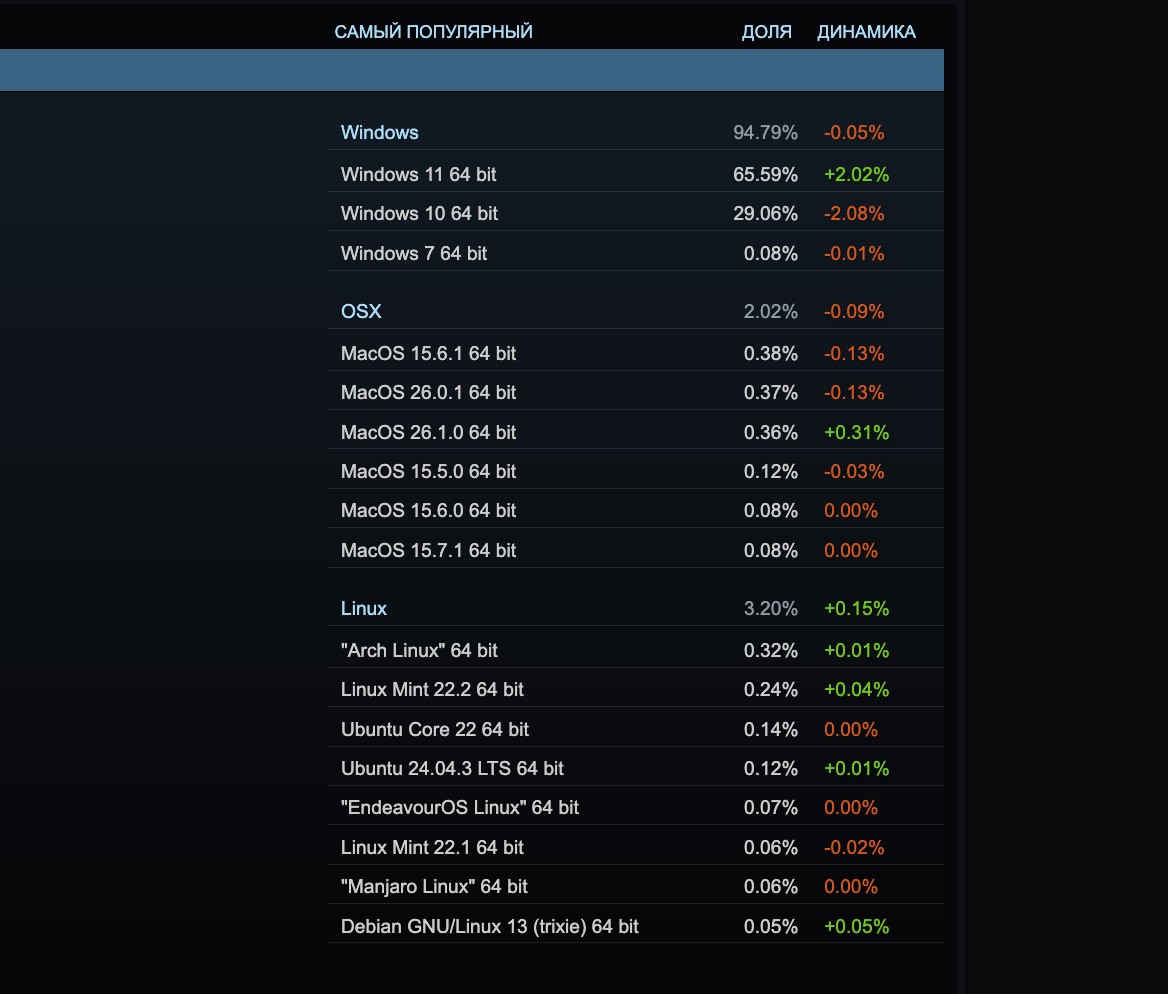 Стоит отметить, что количество игроков на Linux может ощутимо вырасти после запуска официальных Steam Machine в начале 2026 года.