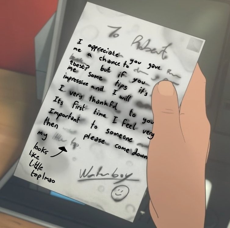 Фанат под ником N3lgs недавно потратил время на изучение послания и попытался перевести максимум возможного. Многое в записке всё ещё слишком сложно разобрать, но она начинается с того, что Водобой ценит предоставленный Робертом шанс и очень ему благодарен.