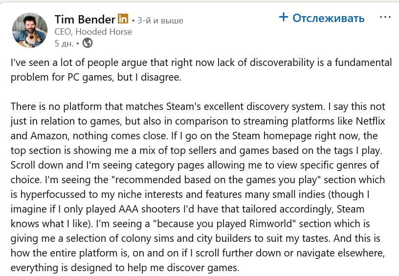 Бендер подчеркнул, что главная страница магазина показывает пользователям микс из топовых проектов и игр, подобранных на основе предпочтений, а разделы рекомендаций учитывают даже нишевые интересы игроков. По его мнению, платформы должны приветствовать всех разработчиков и позволять аудитории самостоятельно определять популярность проектов, а стабильность студий должна зависеть от реалистичной оценки потенциальной аудитории относительно затрат на разработку.
