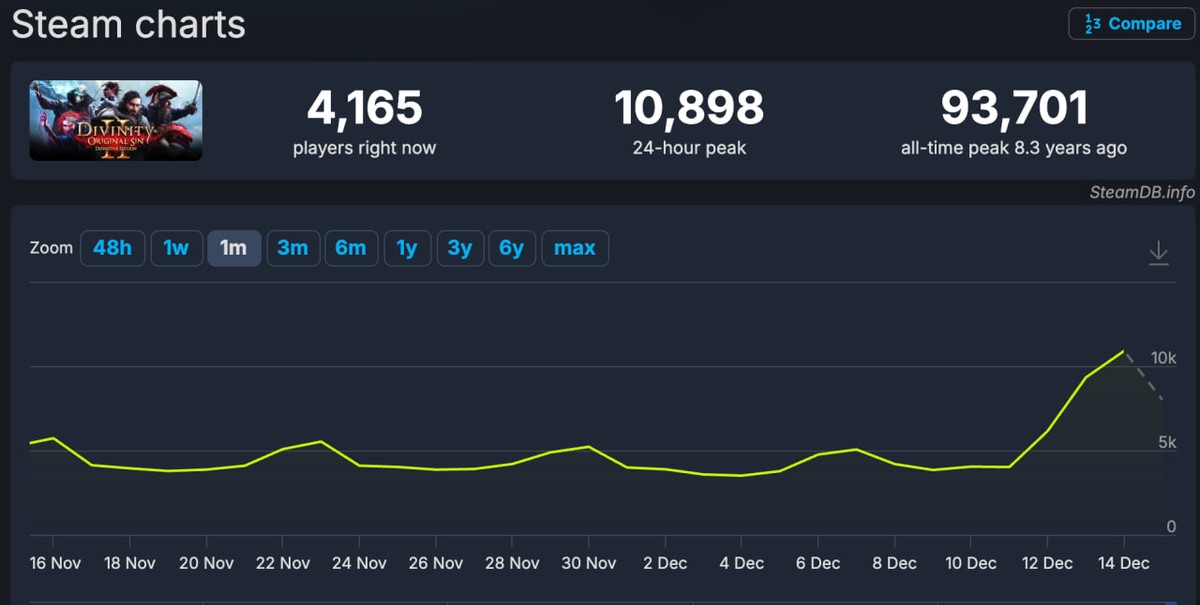 SteamCharts показывает, что игра ворвалась в топ-100 по итогам недели, а сейчас она близка к 200-му месту. Похожую динамику, хоть и с меньшими цифрами, показала Divinity: Original Sin, увеличив месячный пик с 941 до 2150 игроков.