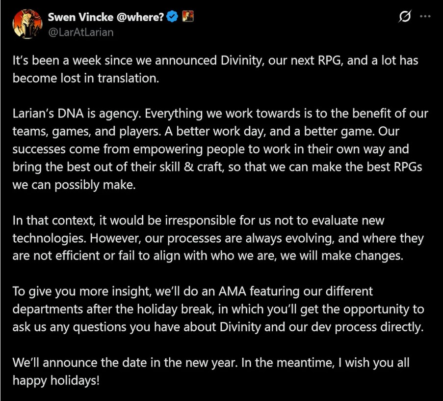 Студия Larian и ее глава Свен Винке столкнулись с волной критики после недавних комментариев об использовании генеративного искусственного интеллекта в разработке. Вместо того чтобы наслаждаться вниманием к первому проекту после Baldur's Gate 3 – игре Divinity, представленной на The Game Awards, – команда была вынуждена объясняться с разъяренными фанатами. Теперь Винке пообещал провести открытую сессию вопросов и ответов в новом году, где разработчики из разных отделов студии смогут лично рассказать о своих рабочих процессах.