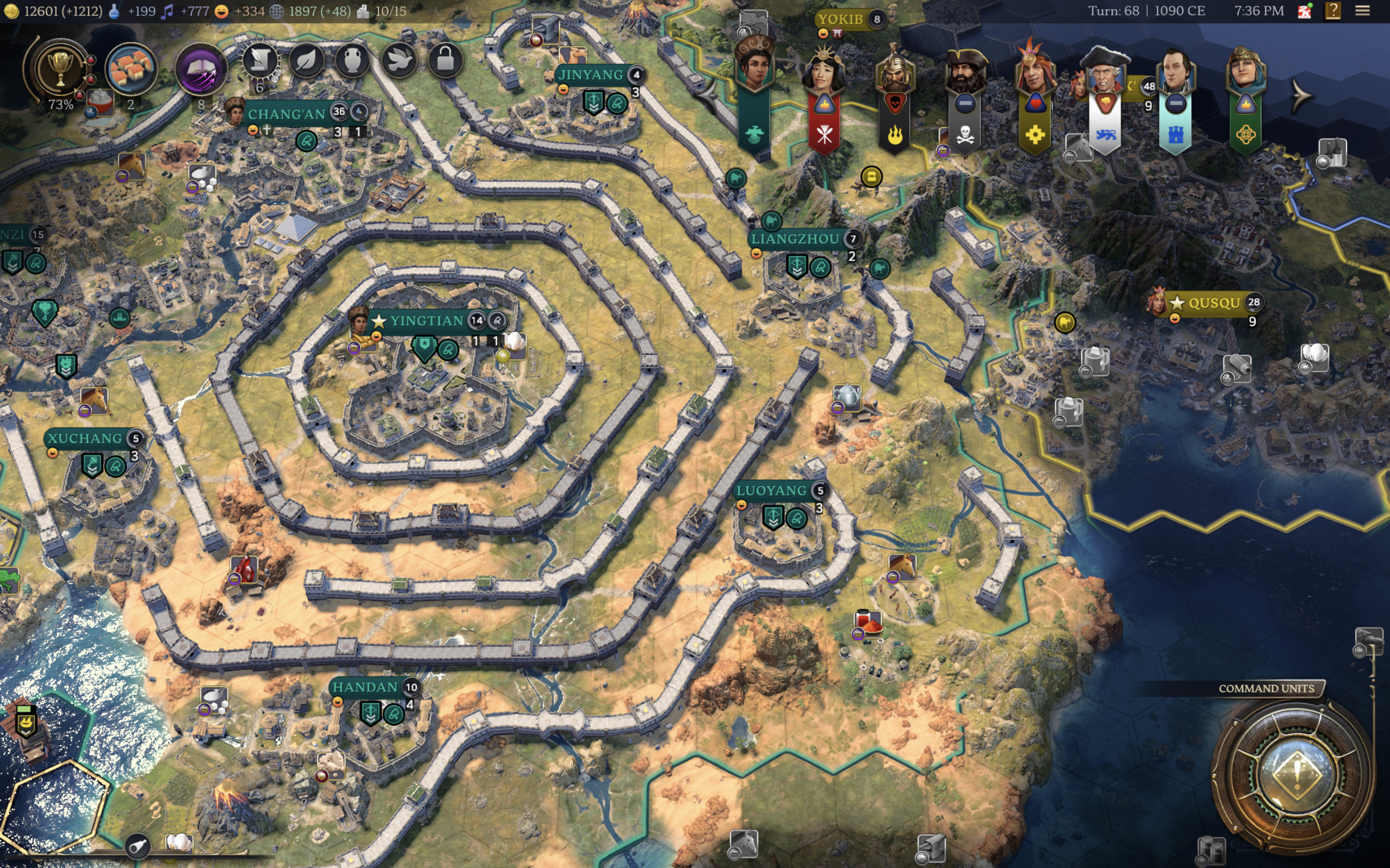 На скриншоте видна столица Интянь, окруженная несколькими кольцами стен, создающими сложную многоуровневую оборонительную систему. Города Чанъань, Синьчан, Цзиньян, Ханьдань, Лянчжоу и Луоян также защищены масштабными укреплениями, соединенными в единую сеть.