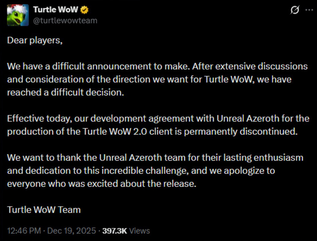 Дорогие игроки, нам предстоит сделать сложное заявление. После обширных обсуждений и анализа направления развития Turtle WoW мы приняли трудное решение. С сегодняшнего дня наше соглашение о разработке с Unreal Azeroth по созданию клиента Turtle WoW 2.0 окончательно прекращено.