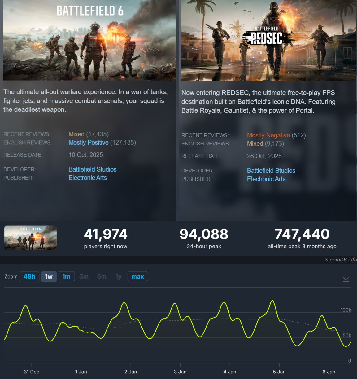Battlefield 6 переживает сложный период – впервые с момента релиза количество игроков в Steam опустилось ниже отметки в 100 тысяч человек. Одновременно с этим изменились и пользовательские оценки: рейтинг недавних рецензий игры упал с "В основном положительные" до "Смешанные", а режим REDSEC и вовсе скатился с "Смешанных" до "В основном отрицательных".