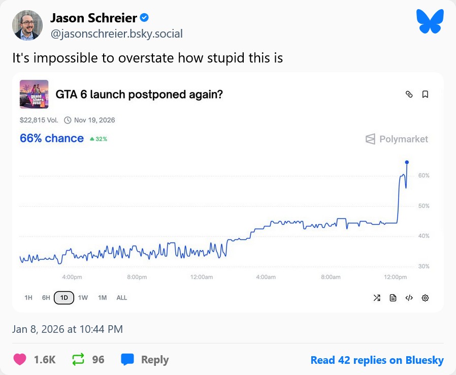 Шрайер обратил внимание, что на платформе Polymarket резко выросло количество ставок на третий перенос GTA 6.