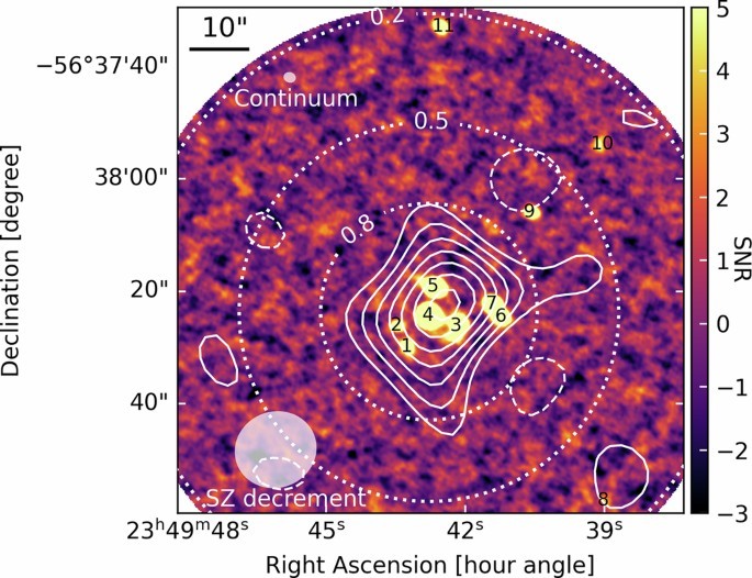 Команда обнаружила странные показатели при анализе наблюдений телескопа Atacama Large Millimeter/submillimeter Array (ALMA) в пустыне Атакама в Чили, изучавшего "младенческое" скопление галактик SPT2349-56.