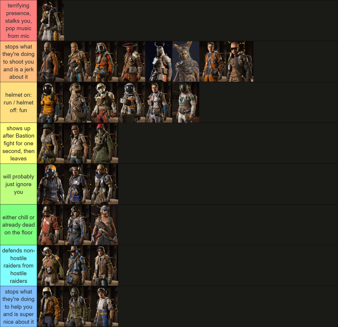 Неудивительно, что черно-оранжевый скин Ryder, которому игроки не доверяют с ноября, возглавил категорию "бросает все дела, чтобы застрелить тебя, и ведет себя как мудак". Закономерно, что самые агрессивные костюмы выглядят соответствующе – темные цвета, маски, очки и рога. Те, кто предпочитает играть в ARC Raiders как в королевскую битву, одеваются для работы.
