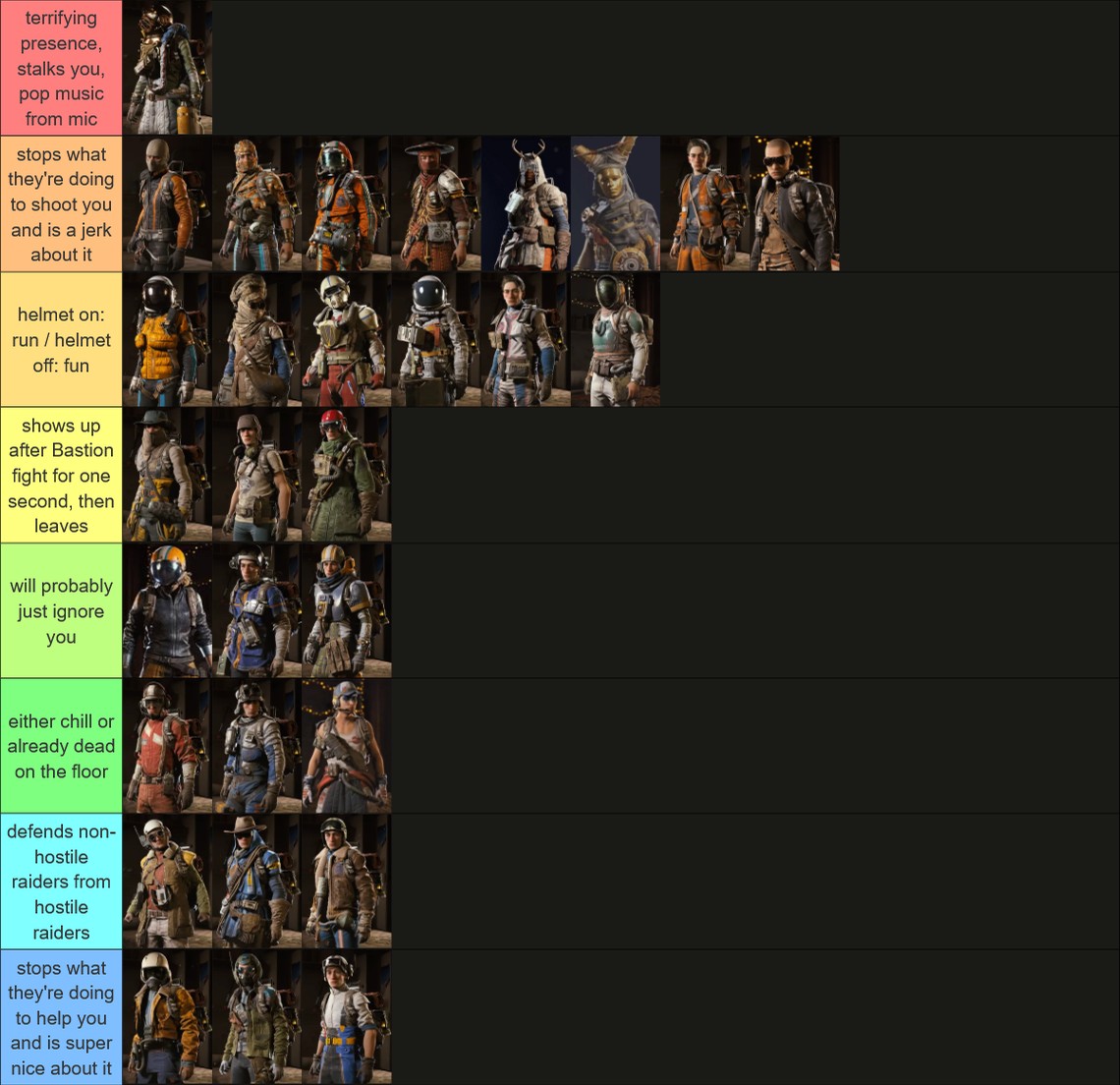 Тир-лист включает только те костюмы, которые автор встречал достаточно часто для оценки, но 30 проанализированных вариантов – неплохой срез текущего гардероба игры.