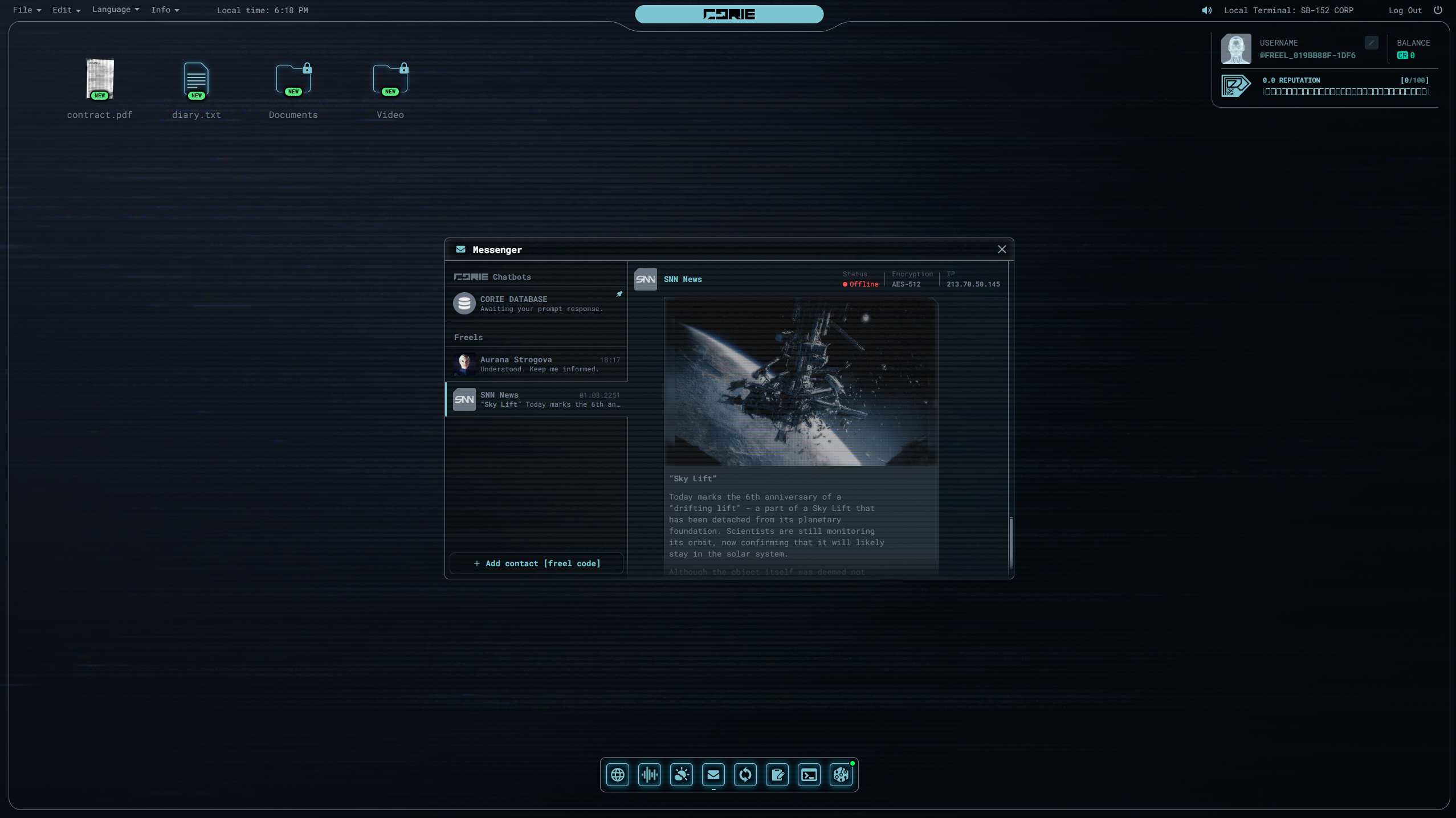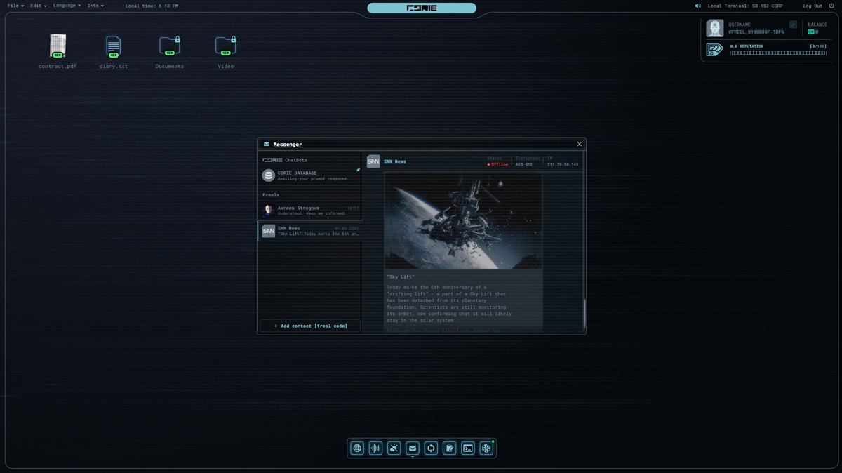Операционная система CORIE предлагает ряд опций: проверку сообщений, взаимодействие с виртуальным браузером, информацию об апокалиптической погоде и хриплое радио. Доступны блокнот, модуль обновлений и серия ежедневных заданий, включающих анализ файлов и поиск ошибок в них.