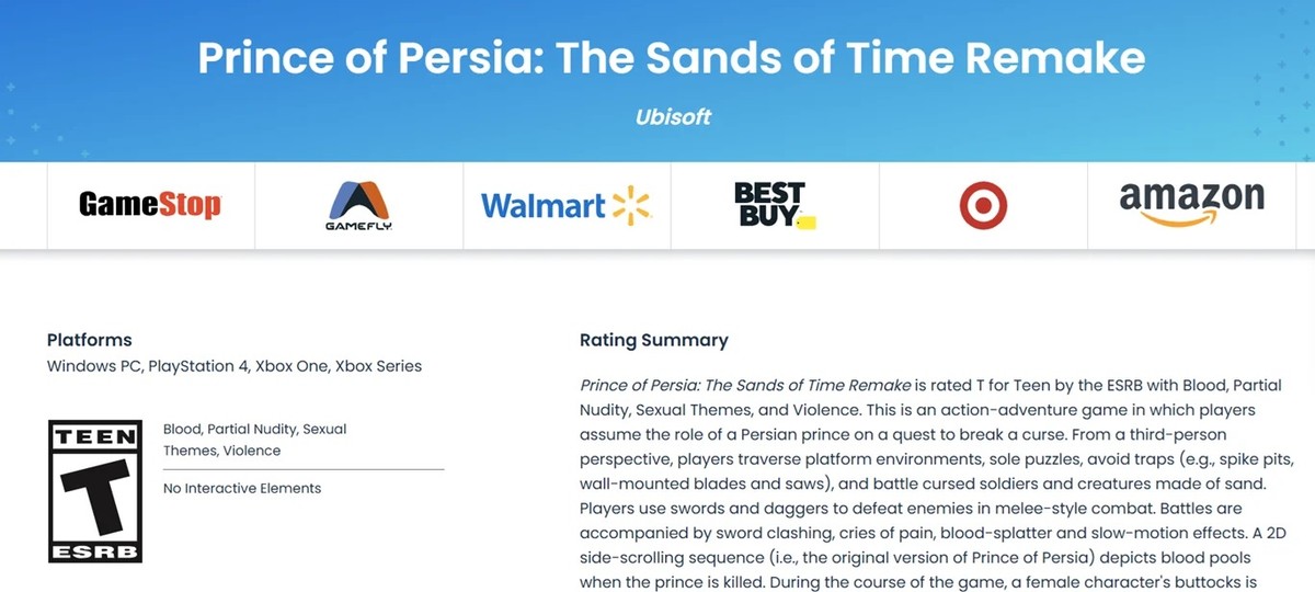 Рейтинговое агентство ESRB официально присвоило оценку ремейку Prince of Persia: The Sands of Time, что подтверждает платформы и содержание игры, а также указывает на возможное приближение анонса даты релиза. В листинге значатся PC, PlayStation и Xbox.