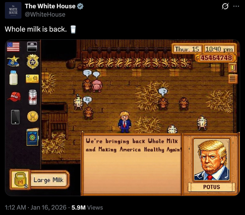 14 января Трамп подписал закон, отменяющий ограничения эпохи Обамы на жирность молока в школьном питании. Белый дом сопроводил событие ИИ-изображением, явно основанным на Stardew Valley. На картинке показан пиксель-арт спрайт Трампа с инвентарём, включающим кепку MAGA и полицейский значок, а также фраза "Мы возвращаем цельное молоко и делаем Америку снова здоровой".
