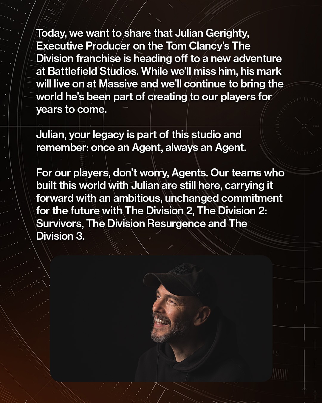 Сегодня мы хотим сообщить, что Джулиан Герити, исполнительный продюсер франшизы Tom Clancy's The Division, отправляется в новое приключение в Battlefield Studios. Мы будем скучать по нему, но его вклад останется в Massive. Мы продолжим развивать мир, который он помогал создавать, для наших игроков на протяжении многих лет. Джулиан, твое наследие – часть этой студии.