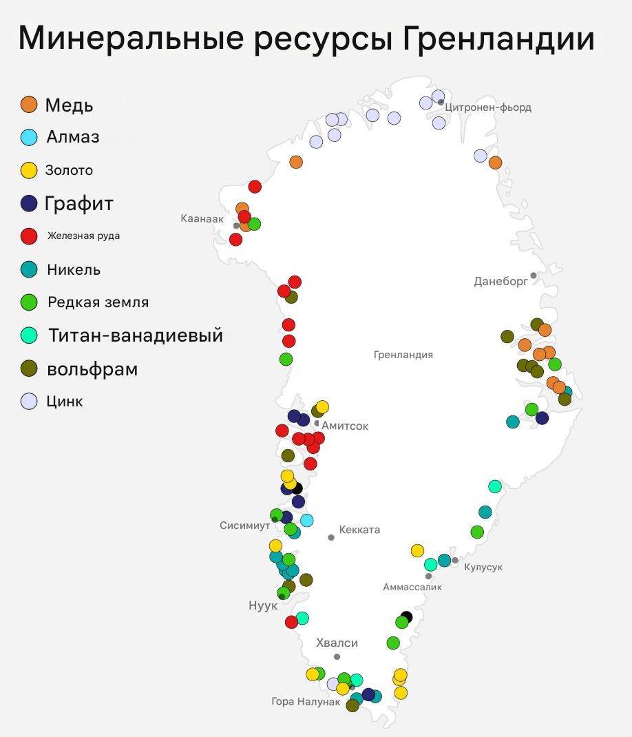 Под всем этим льдом и вечной мерзлотой скрывается настоящая сокровищница минералов. – графит, цинк и редкоземельные элементы. По сути, по мере потепления климата и таяния гренландского льда всё больше этих минералов станут доступны для добычи.