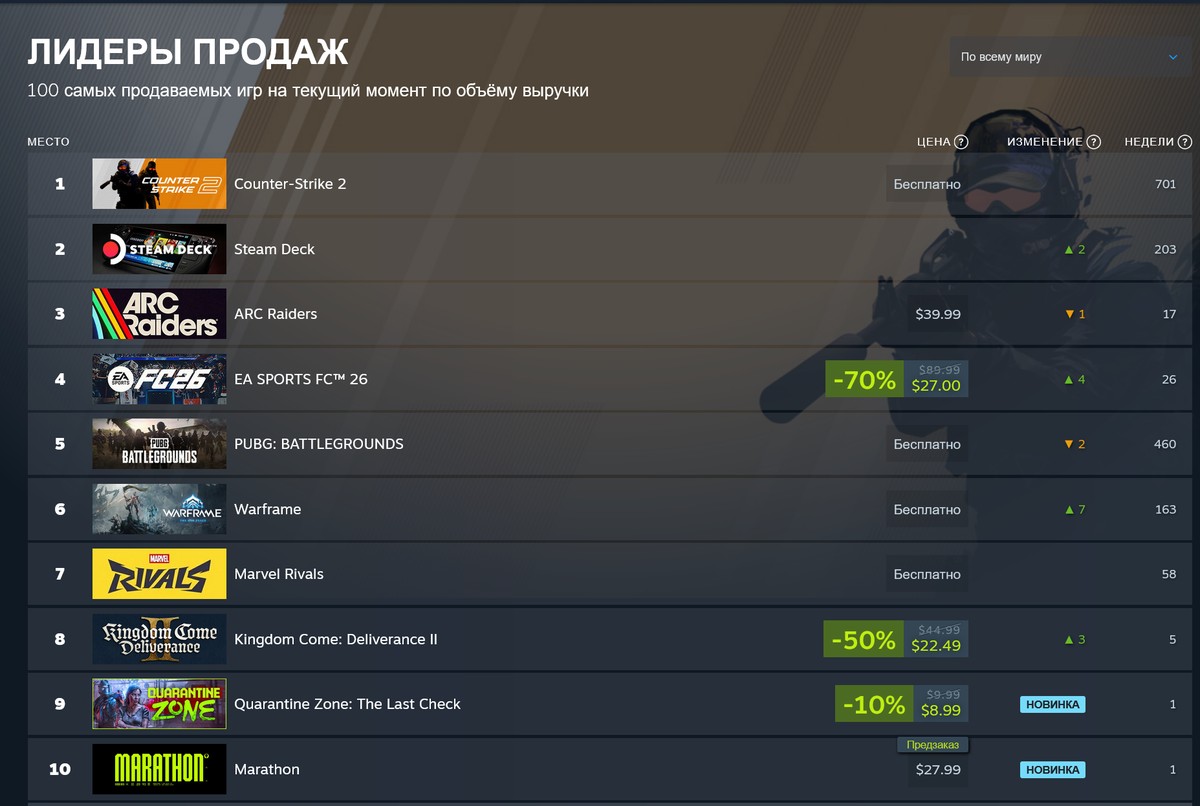После объявления даты релиза Marathon стала доступна для предзаказа и неожиданно попала в топ-10 самых продаваемых игр Steam. Проект занимает пятое место в США и десятое в глобальном рейтинге, уступая в категории платных тайтлов только Quarantine Zone: The Last Check, ARC Raiders, EA Sports FC 26 (продается со скидкой 70%) и Kingdom Come: Deliverance II (доступна с 50-процентной скидкой).