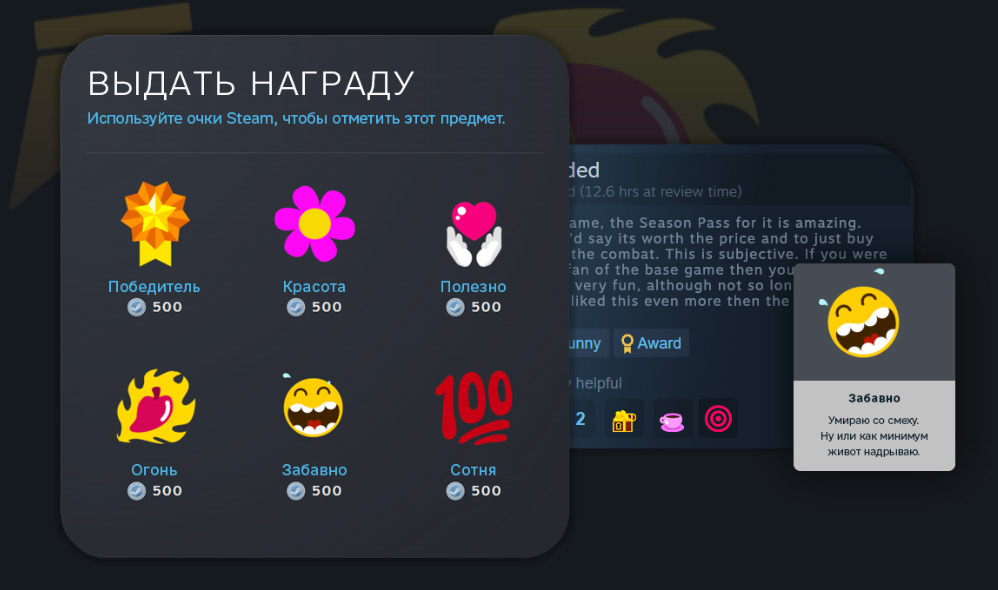 Как и раньше, эти награды можно приобретать за очки Steam (заработанные при покупке игр) и использовать в сообществе Steam, чтобы выразить признательность за пользовательские обзоры, сообщения на форумах, руководства, скриншоты, изображения, модификации для мастерской или отметить профиль вашего друга в Steam.