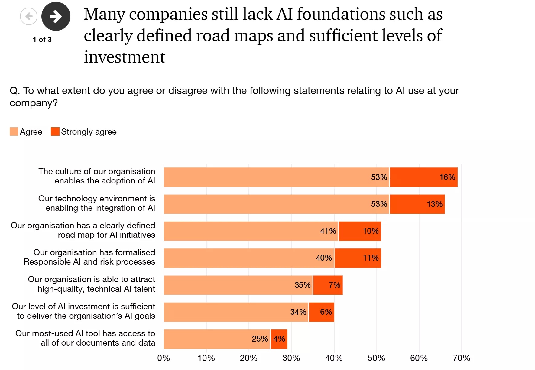 Вместо того чтобы задаться вопросом, является ли ИИ золотым билетом, нарратив PwC смещает фокус – компании с сильным "ИИ-фундаментом" (включая фреймворки ответственного ИИ и технологические среды для интеграции) в два-три раза чаще сообщают о значимых финансовых результатах.