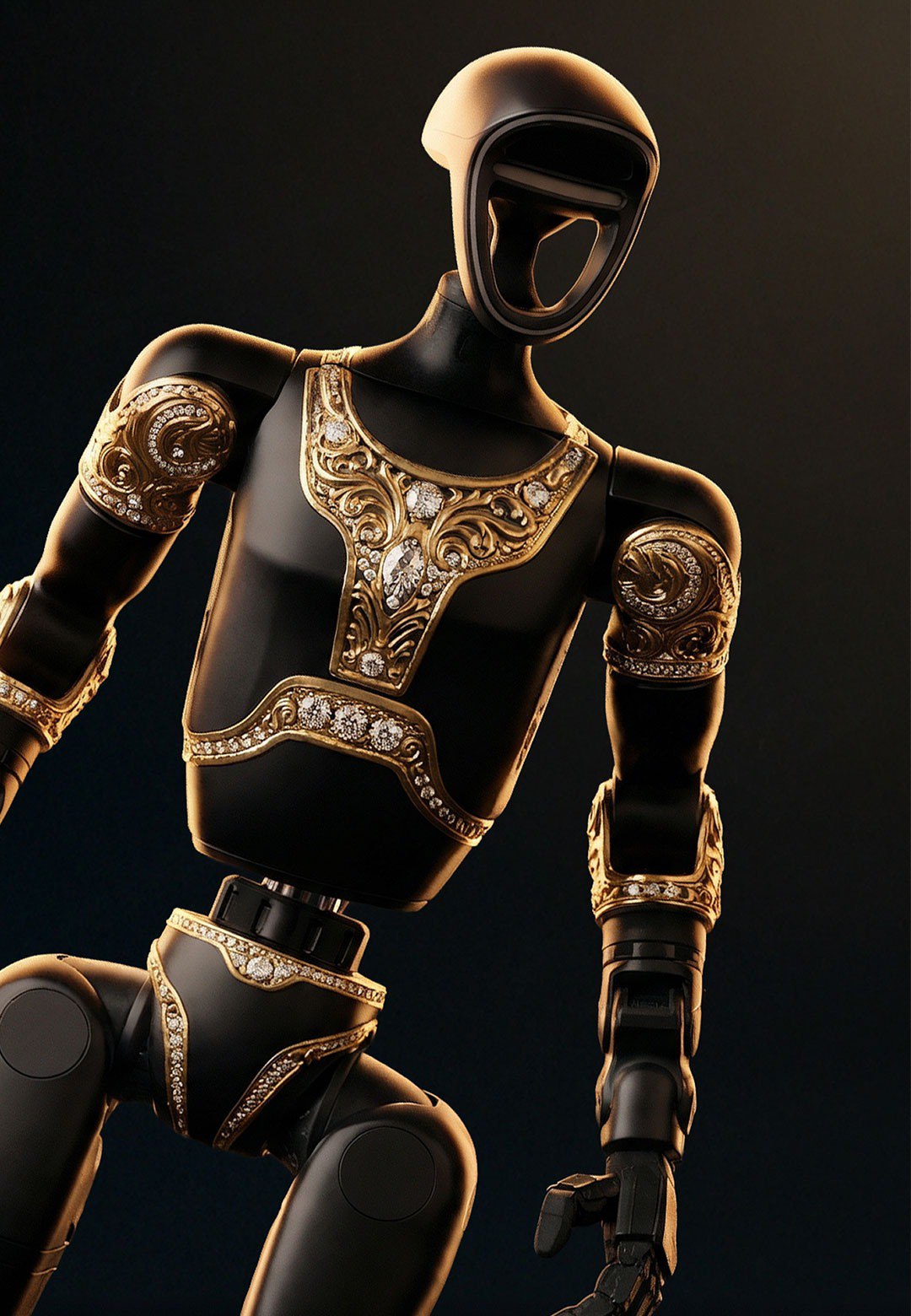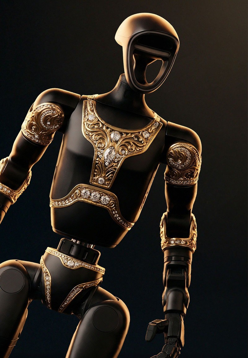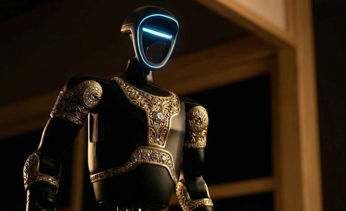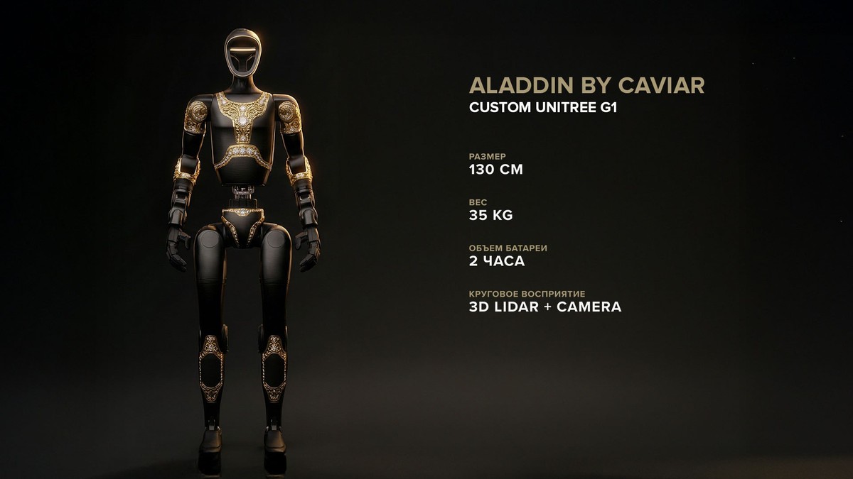 Caviar, известная люксовыми версиями iPhone из золота, переключилсью.. на роботов. Компания представила концепт под названием "Аладдин", выполненного в духе "Тысячи и одной ночи". В основе проекта лежит серийный робот Unitree G1 китайской компании Unitree Robotics, который российский бренд украсил золотыми орнаментами и превратил в арт-объект.