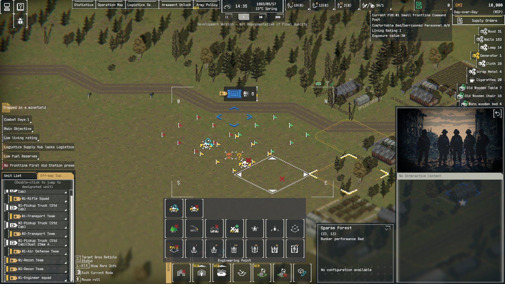 Здания в игре состоят из модульных комнат и разрушаются динамически. В последних обновлениях разработчик добавил мины и инженеров, улучшил генерацию болот и рек, а также встроил редактор отчётов о операциях для документирования боевых действий.