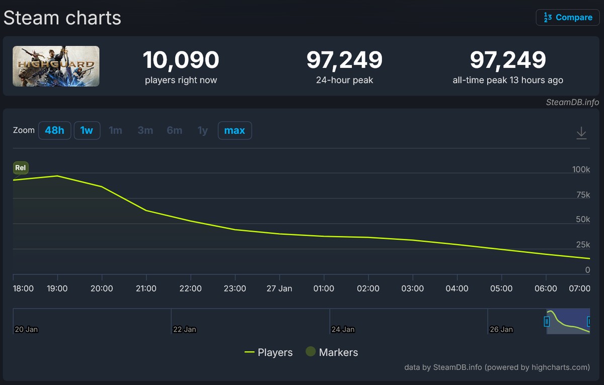 Игра вышла на ПК, PS5 и Xbox Series 26 января и сразу привлекла около 100 тысяч одновременных пользователей в Steam, что для нового проекта от новой студии оказалось неплохим результатом. Увы, злую шутку с разработчиками сыграла неизвестность о проекте и отсутствие тестов – в первый день многие просто не могли зайти в матчи из-за нагрузки на сервера.