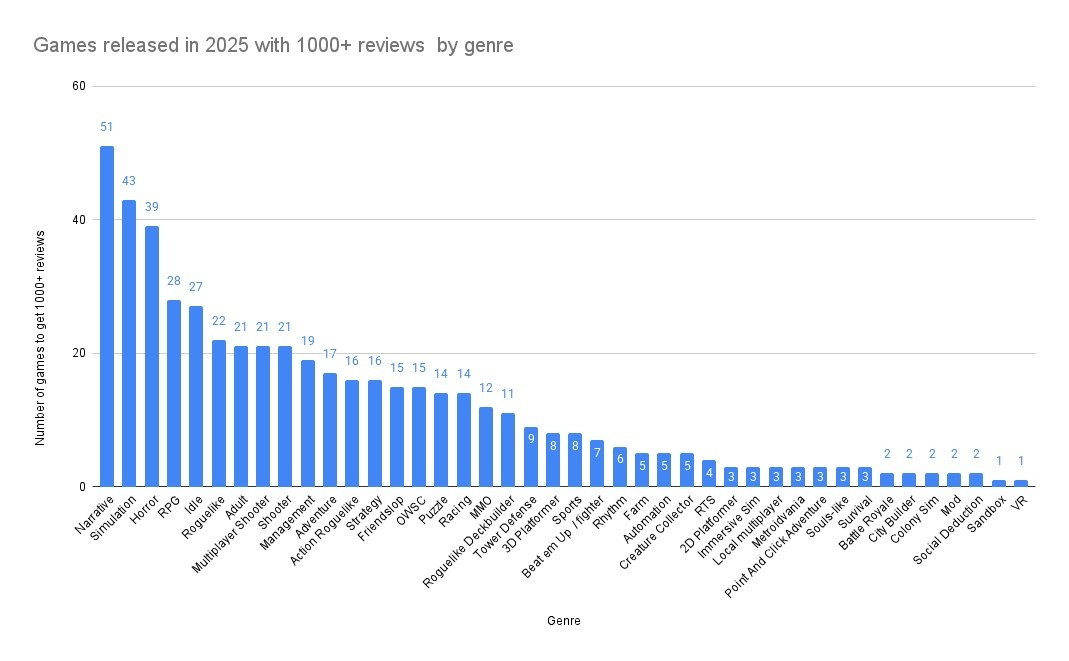 За 2025 год в Steam вышло более 20 тысяч игр, но только 608 получили более 1000 отзывов