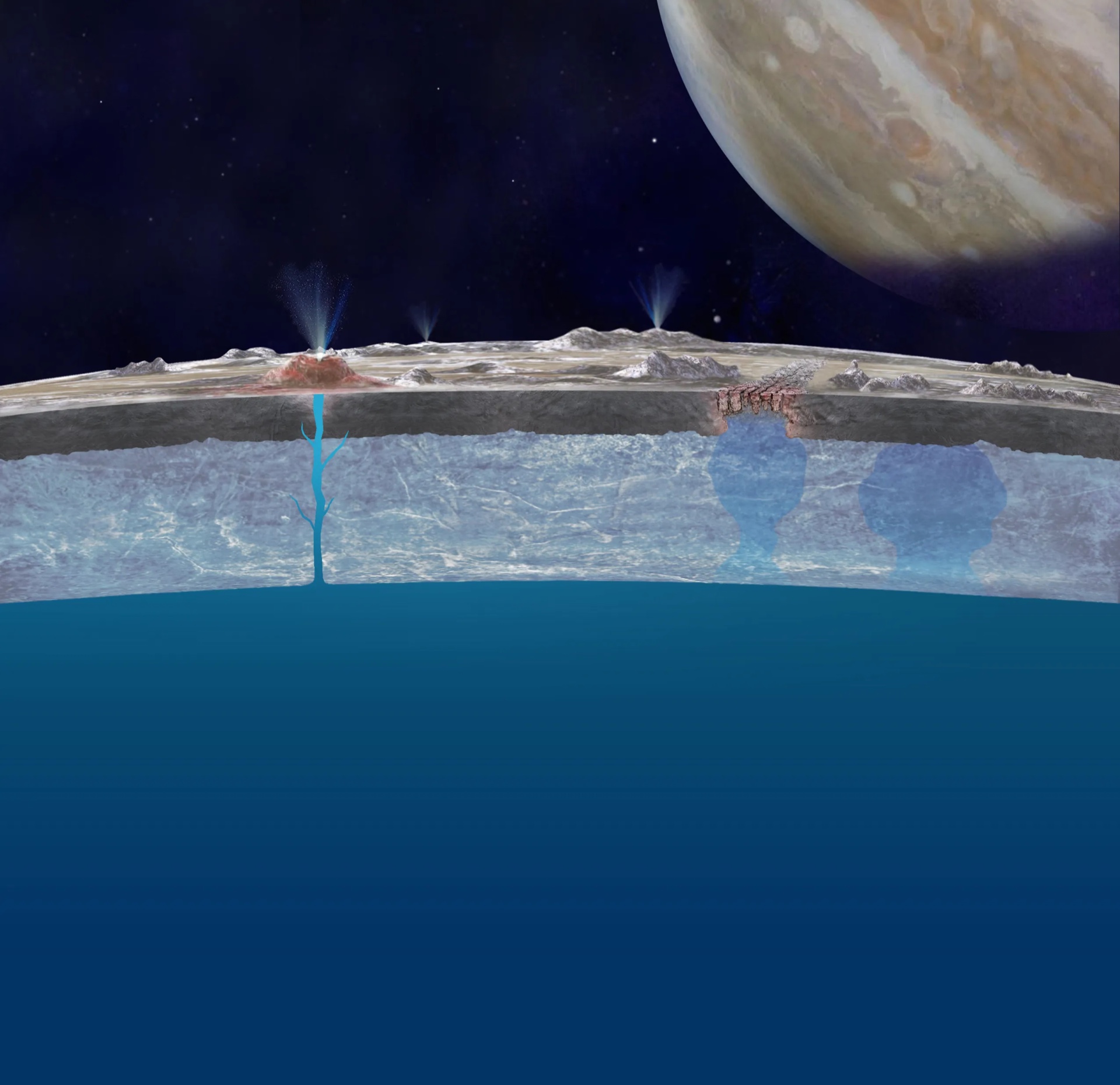 Толщина ледяной оболочки и существование трещин или пор внутри неё – часть сложной головоломки для понимания потенциальной обитаемости Европы.