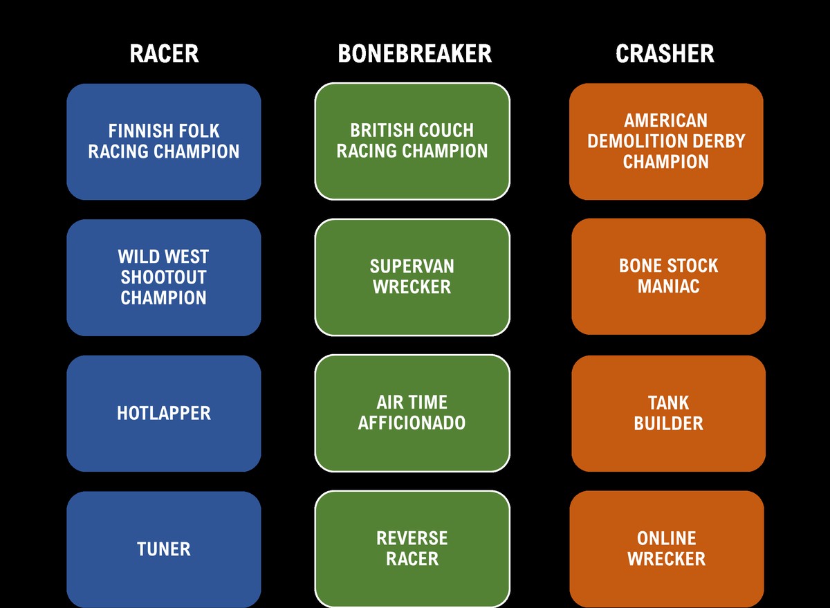 Студия решила учесть, что игроки приходят в игру с разными целями. Режим карьеры предложит выбор из трех игровых профилей. Первый ориентирован на чистые гонки, второй – на дерби и контактные заезды, а третий получил название "The Bonebreaker". Последний профиль создан для тех, кто хочет веселья через "нелепые сценарии с транспортом" – вроде гонок газонокосилок против моторизованных унитазов и автодомов.