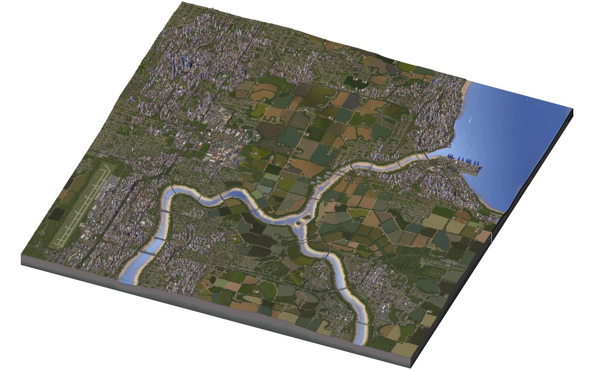 На детализированном скриншоте видны все элементы реалистичной городской застройки – плотный центральный деловой район с небоскрёбами, обширные пригороды, промышленные кварталы, порт на побережье, крупный аэропорт и сельскохозяйственные угодья, окружающие урбанизированную территорию. Железнодорожные пути пронизывают весь город, включая кольцевые развязки для разворота составов. Две объединяющиеся реки разделяют метрополию на несколько районов, соединённых многочисленными мостами.