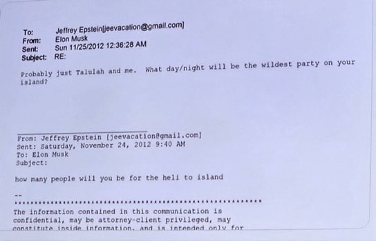 Маск отрицает какие-либо правонарушения и заявляет, что никогда не посещал частный остров Эпштейна в Карибском море, известный как Литтл-Сент-Джеймс. Хотя прямых доказательств визита нет, из переписки 2012-2014 годов явно следует интерес Маска к встречам с Эпштейном. Особенно настораживает серия писем за декабрь 2012 года, где обсуждается некое "соотношение" на вечеринках Эпштейна. В одном из сообщений Эпштейн написал: "Соотношение на моем острове может смутить Талулу", на что Маск ответил: "Соотношение не проблема для Талулы". Речь шла о тогдашней жене Маска, британской актрисе Талуле Райли. Вероятно под "соотношением" шла речь о количестве женщин на мужчину на острове.