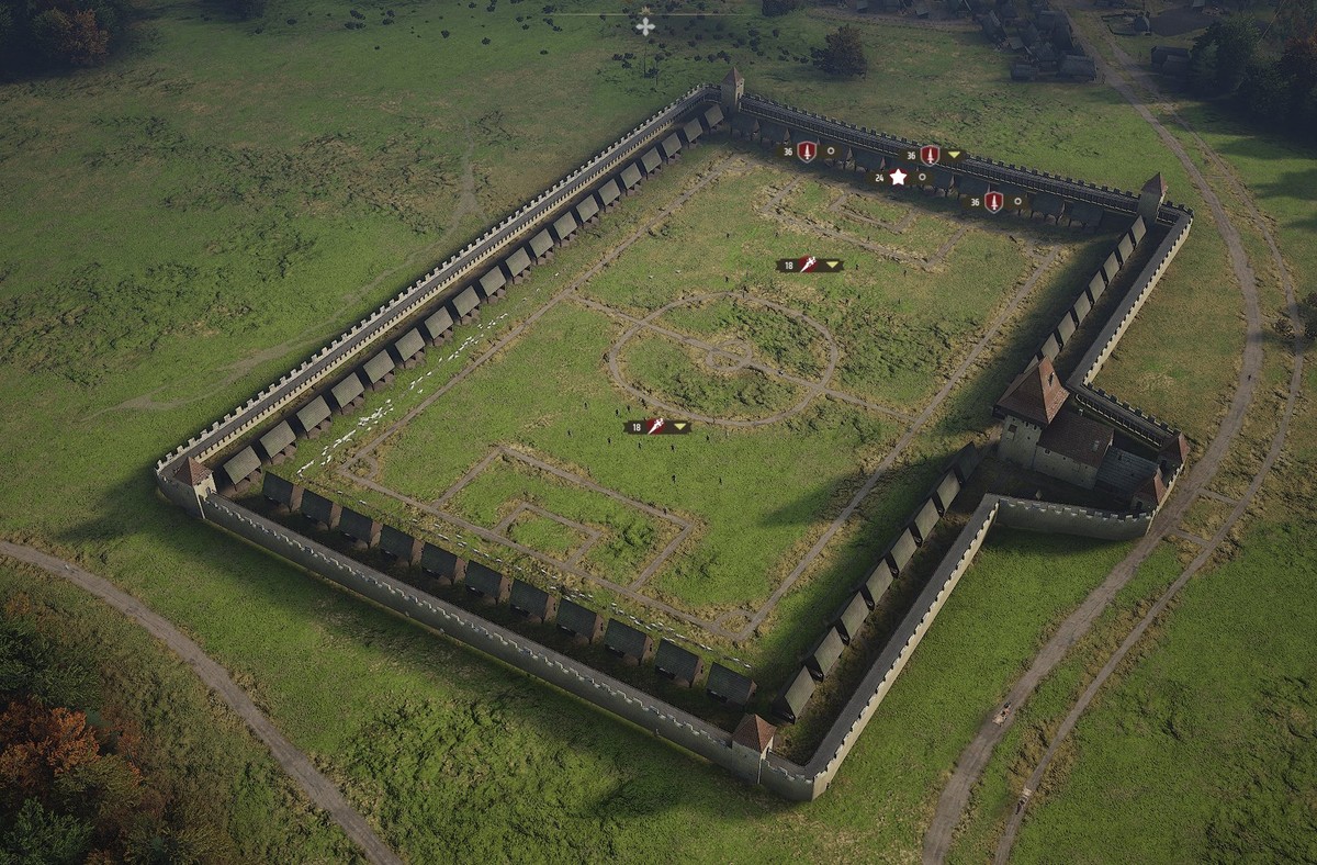 В Manor Lords нет функции строительства стадиона, как и вообще спорта, поэтому игрок проявил изобретательность и использовал имеющиеся инструменты. Разметку футбольного поля с центральным кругом и штрафными зонами он создал с помощью грунтовых дорог, используя гибкую систему прокладки путей. Внешний контур стадиона собран из замковых стен через планировщик замков, а торговые лавки рынка превратились в подобие трибун и VIP-лож по периметру. Роль футболистов исполняют отряды ополчения.