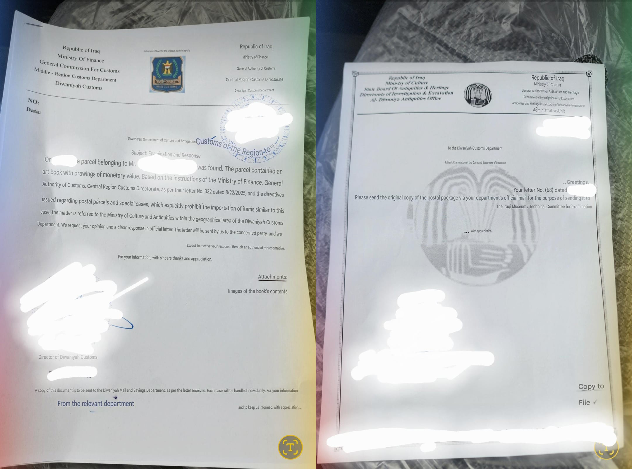 Реддитор Ahmed15252 опубликовал документы, показывающие, что артбук из посылки был отмечен как потенциально имеющий культурную ценность и отправлен в Министерство культуры и древностей Ирака для проверки. Согласно письму, власти запросили у министерства "мнение и четкий ответ", что говорит о необходимости официального подтверждения перед выдачей посылки.