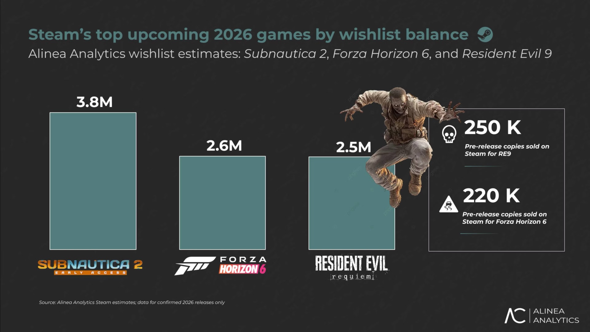 Согласно данным аналитического сервиса Alinea Analytics, Subnautica 2 занимает первое место среди самых добавляемых в список желаемого игр с релизом в 2026 году. Сиквел набрал около 3,8 миллиона добавлений в список желаемого – на 1,2 миллиона больше, чем у Forza Horizon 6, и значительно опережает Resident Evil Requiem с показателем 2,5 миллиона.