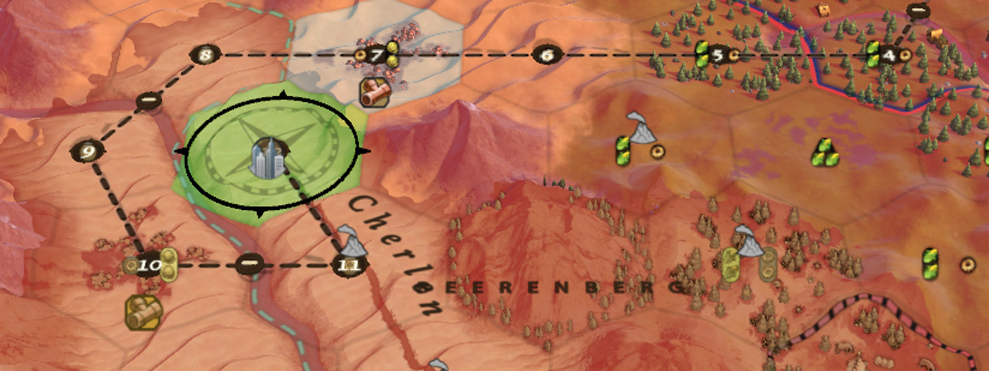 На скриншоте видно, как запланированный путь огибает город по широкой дуге через пустынные тайлы вместо того, чтобы на 8-м ходу сделать шаг в сторону город. Учитывая, что на ранних этапах каждый ход занимает огромное количество внутриигровых лет, такой маневр будет стоить Поселенцу столетия.