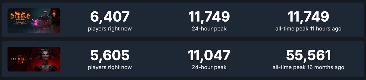 Согласно данным Steam DB, 24-часовой пик Diablo 2: Resurrected составил 11 749 игроков, тогда как у Diablo 4 этот показатель остановился на отметке 11 047. При этом абсолютный рекорд у четвёртой части значительно выше – 55 561 игрок, но он был установлен 16 месяцев назад. У ремастера второй Diablo текущий пик одновременно стал максимумом в Steam.