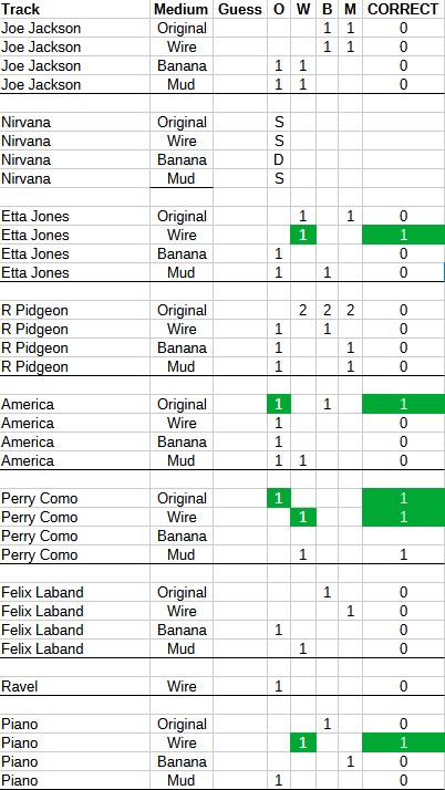 Участникам предложили четыре версии одного и того же 30-секундного фрагмента: оригинальную запись с компакт-диска и три варианта, пропущенных через разные проводники – около 175 сантиметров профессионального медного провода, медный провод с 20-сантиметровым участком из влажной грязи, и медный провод с участком из 12-сантиметрового банана. Задача слушателей – определить, какая версия есть какая.