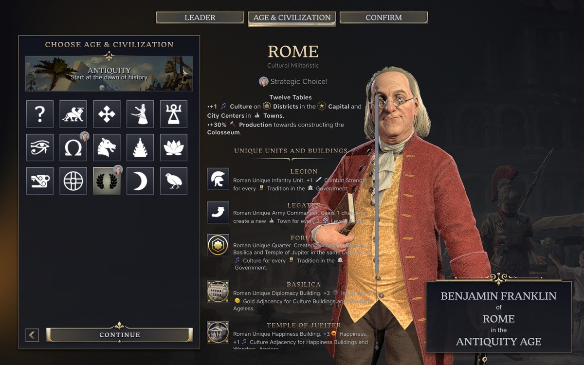 Спустя почти год после релиза Sid Meier's Civilization 7 игроки продолжают указывать на проблемы с интерфейсом, которые не устранены до сих пор. Поводом для очередной волны обсуждений стал скриншот экрана выбора лидера, где портрет Бенджамина Франклина находится прямо под описательнием – без затемнения и с минимальной читаемостью надписей.