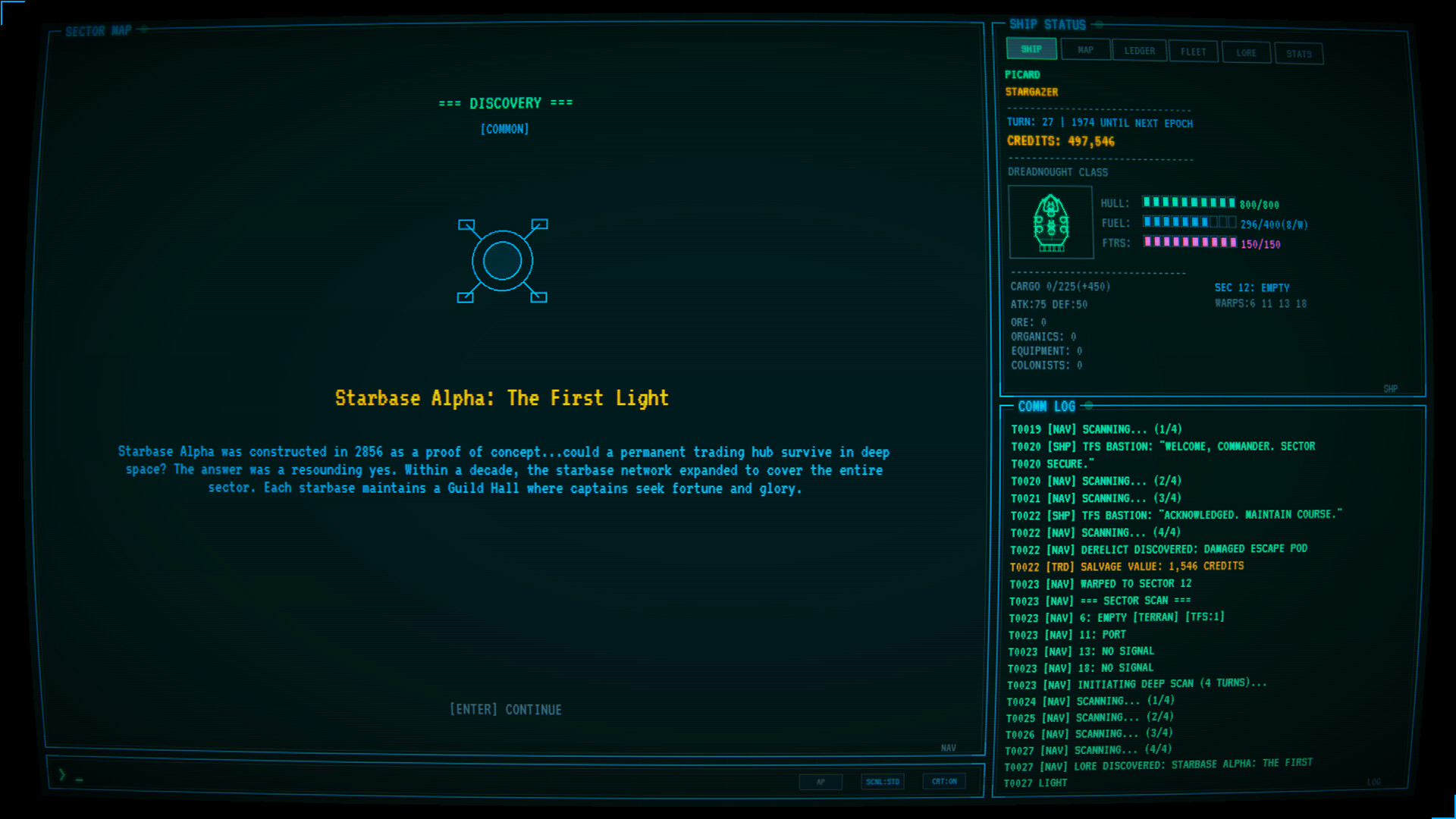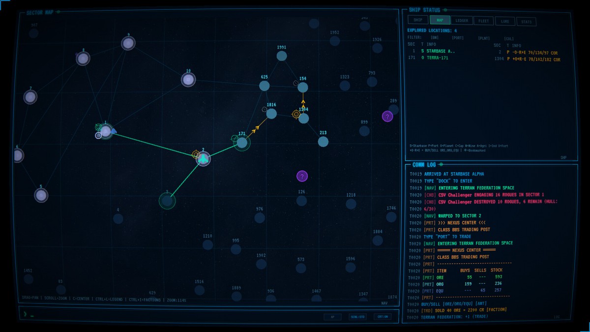 Каждая сессия начинается одинаково: пустой трюм, почти пустой топливный бак и процедурно генерируемая галактика из 2 000 секторов. Дальше – на усмотрение игрока. Экономика строится на пяти торговых зонах с динамическим ценообразованием, учётом усталости рынка, бонусами за дальность перевозок и надбавками за риск.