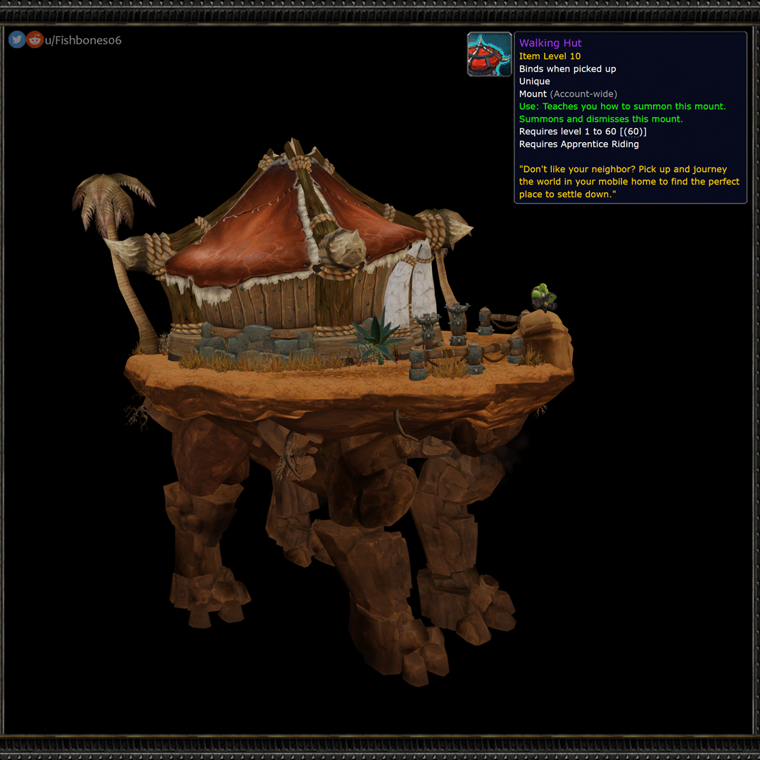 Также есть версия для Орды в виде "Бродячей хижины" (Walking Hut) в пустынном стиле с пальмой и тотемами. Оба концепта оформлены как настоящие внутриигровые предметы с подсказкой "Не нравится сосед? Собирайся и отправляйся в путь на своём мобильном доме, чтобы найти идеальное место для жизни."