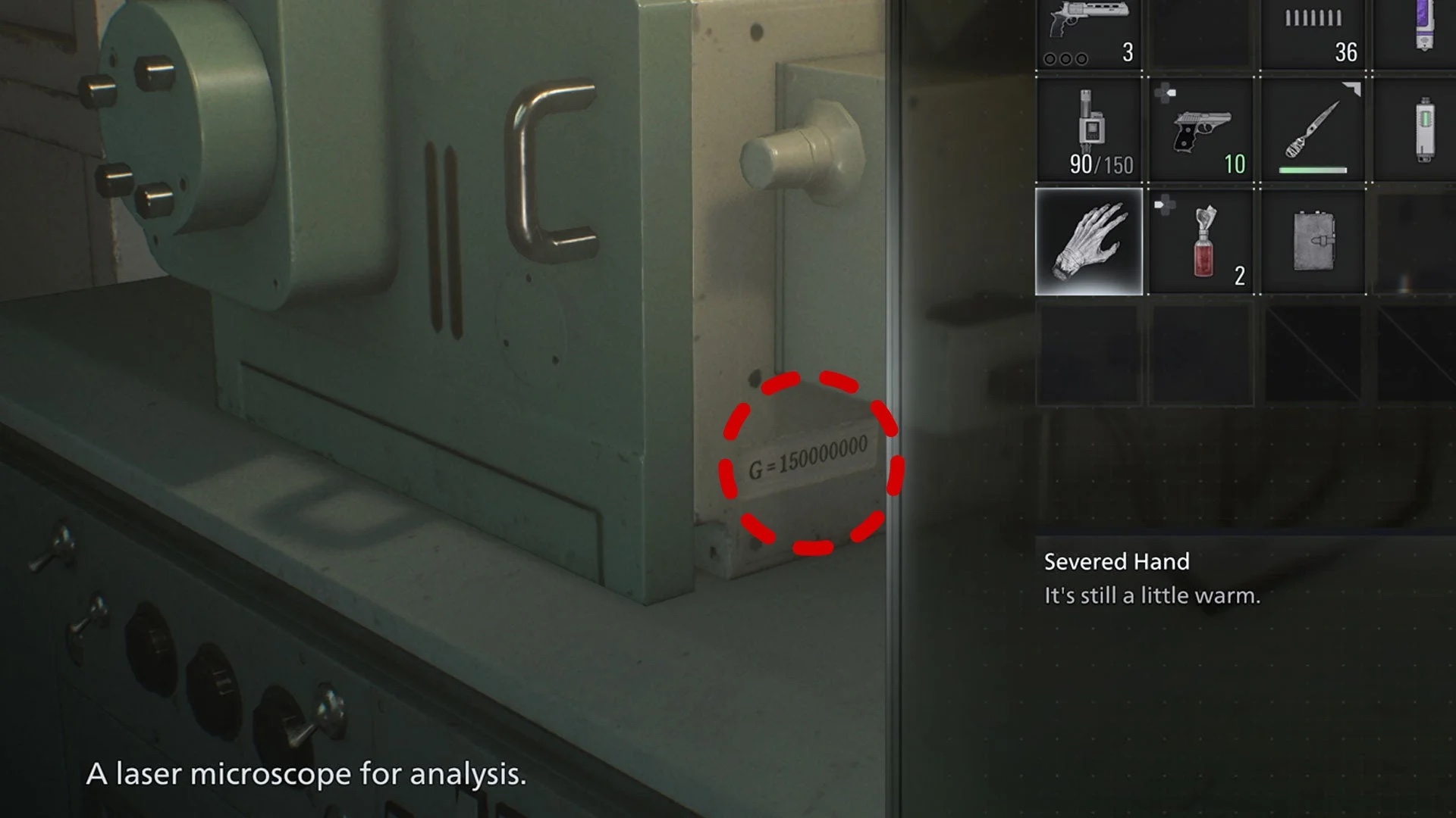 Однако если отнести конечность к одному из микроскопов в Лаборатории крови (Blood Lab) или в кабинете Западного крыла (West Wing's Office) и отсканировать так же, как обычные образцы крови, вместо привычных рецептов для крафта на экране появляется следующий текст: