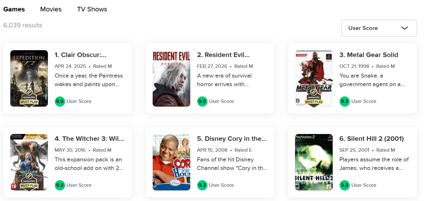 Удивительно, но в последние дни именно фанаты Resident Evil Requiem пришли в пользовательские оценки Clair Obscur: Expedition 33 и выставили игре по 0 баллов. Обе игры обогнали Metal Gear Solid и The Witcher 3, остановившихся на отметке 9.3, которую они делят с оригинальными Silent Hill 2 и Metal Gear Solid 3 – и, да, ещё с диснеевской Cory in the House, что отдельная история о природе пользовательских рейтингов в интернете.