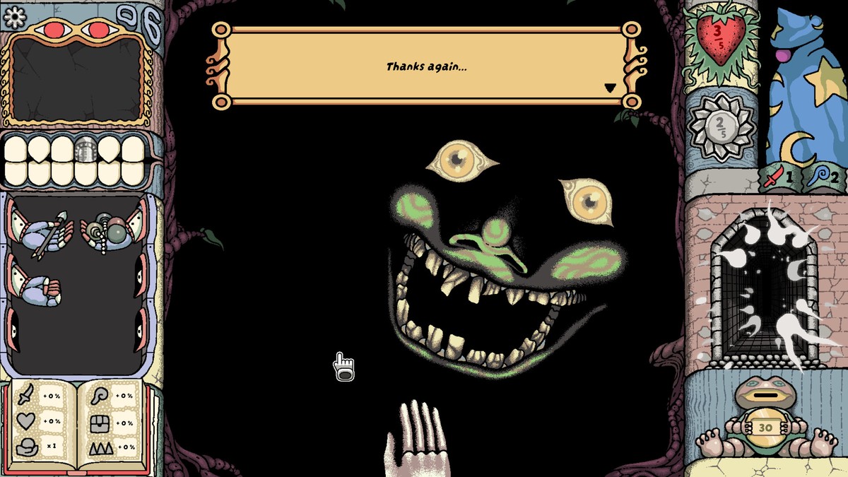 Персонажа можно усиливать с помощью проклятых зубов и магических предметов. Каменные зубы меняют правила и вероятности в пользу игрока, а металлические – запускают разрушительные проклятия и комбо. К этому добавляются предметы от торговца, магические фонтаны и таинственные обитатели подземелья, которые могут поделиться своими секретами.