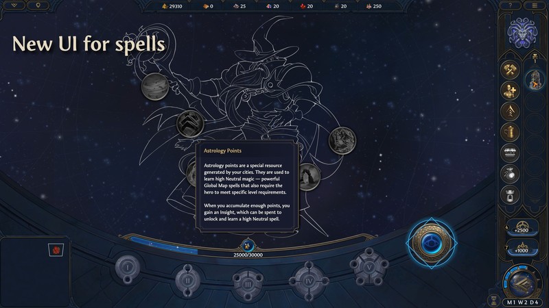 Одним из наиболее ожидаемых изменений стала переработка интерфейса. Разработчики прислушались к пожеланиям сообщества и сделали его значительно более понятным, заодно приблизив визуально к классическому интерфейсу из Heroes III. Отдельно была переделана гильдия магов – теперь она получила собственный обновлённый дизайн, а вместе с ним систему очков астрологии, которые можно тратить на разблокировку глобальных заклинаний.