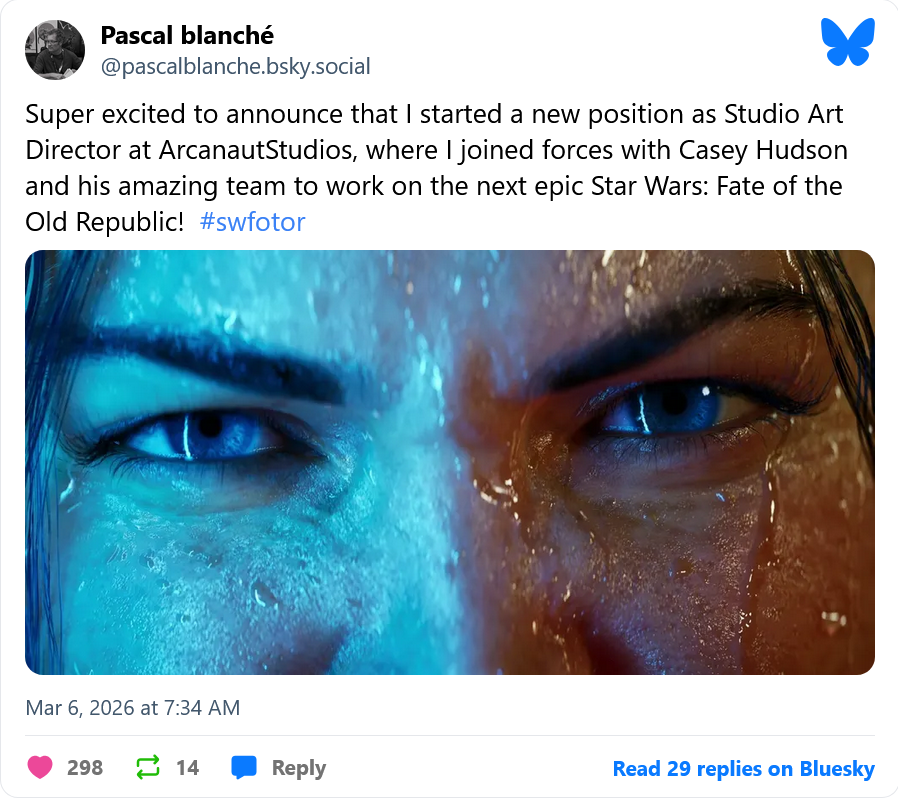 Арт-директор Паскаль Бланше, известный по работе над рядом культовых проектов в Ubisoft, объявил о переходе в Arcanaут Studios – студию, занимающуюся разработкой Star Wars: Fate of the Old Republic. Об этом он сообщил через свой аккаунт в Bluesky, написав, что "начал новую должность арт-директора студии в Arcanaут Studios" и "объединил усилия с Кейси Хадсоном и его замечательной командой для работы над эпической Star Wars: Fate of the Old Republic".