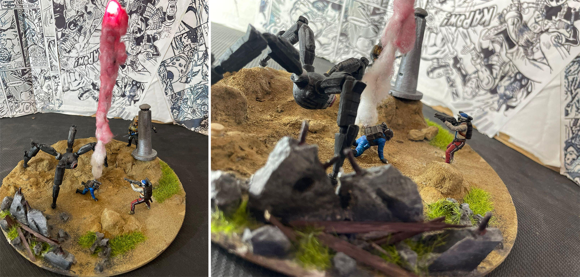 Вторая работа получилась ещё более динамичной. На ней Прыгун (Leaper) атакует группу рейдеров, один из которых уже лежит на земле, а другой в это время спокойно вскрывает зонд, не обращая внимания на хаос вокруг. Над всей сценой поднимается сигнальная ракета, выполненная из окрашенной хлопковой ваты с подсветкой. Именно этот элемент вызвал наибольший восторг среди зрителей.