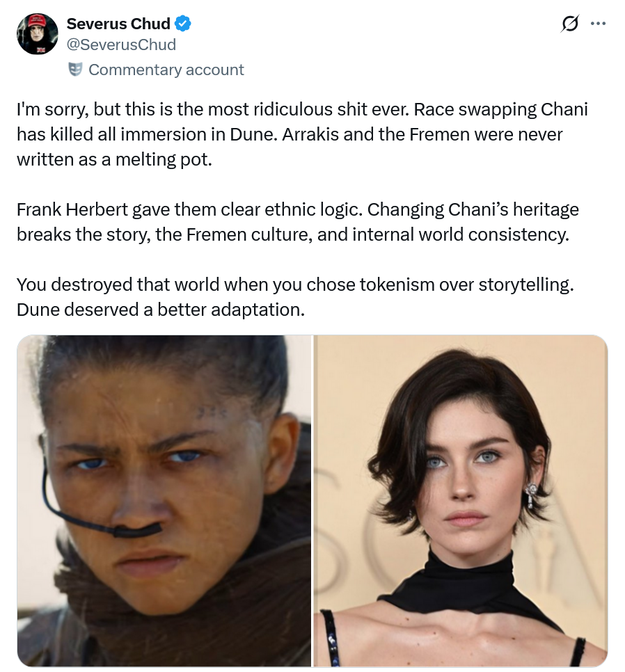 Арракис и фремены никогда не описывались как плавильный котел рас. Фрэнк Герберт наделил их четкой этнической логикой. Изменение происхождения Чани ломает историю и культуру фременов.