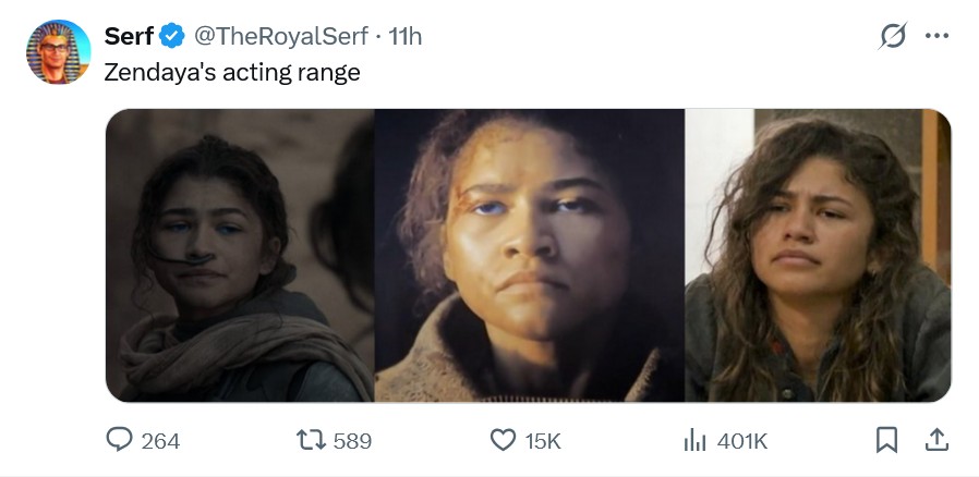 Выход трейлера третьей части "Дюны" вновь всколыхнул давнюю дискуссию о кастинге Зендаи на роль Чани. Фильм завершит адаптацию саги Фрэнка Герберта от режиссёра Дени Вильнёва, и в главных ролях вернутся Тимоти Шаламе в роли Пола Атрейдеса и Зендая в роли Чани, а также появятся новые персонажи в исполнении Роберта Паттинсона и Ани Тейлор-Джой. Премьера запланирована в формате IMAX на 18 декабря.