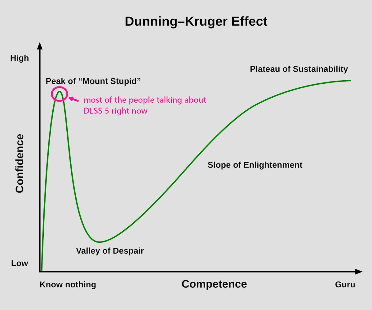 Авасилкутей также опубликовал модифицированный график эффекта Даннинга–Крюгера, на котором разместил большинство критиков DLSS 5 на так называемой "Горе глупости" – точке максимальной уверенности при практически нулевой компетенции в предмете.