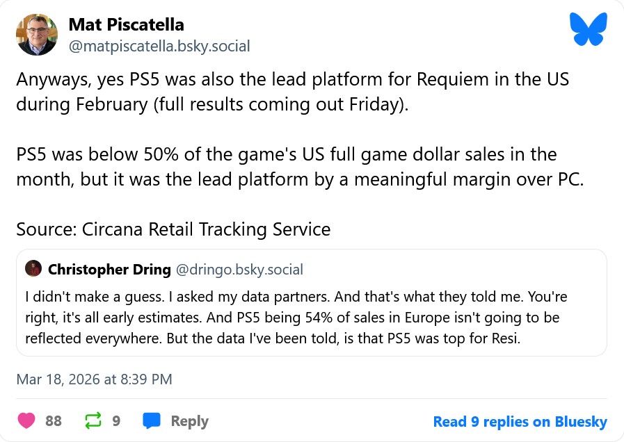 Реальная картина оказалась иной. Аналитик Circana Мэт Пискателла подтвердил, что в США в феврале PS5 стала "ведущей платформой" для новой части серии с "ощутимым отрывом" от ПК. Схожие данные для европейского рынка, японского и австралийского рынков привел Крис Дринг из The Game Business. Он вступил в спор с очень странным фанатом, который утверждал, что в Steam игра продается лучше, затем двое аналитиков сказали, что это совсем не так.