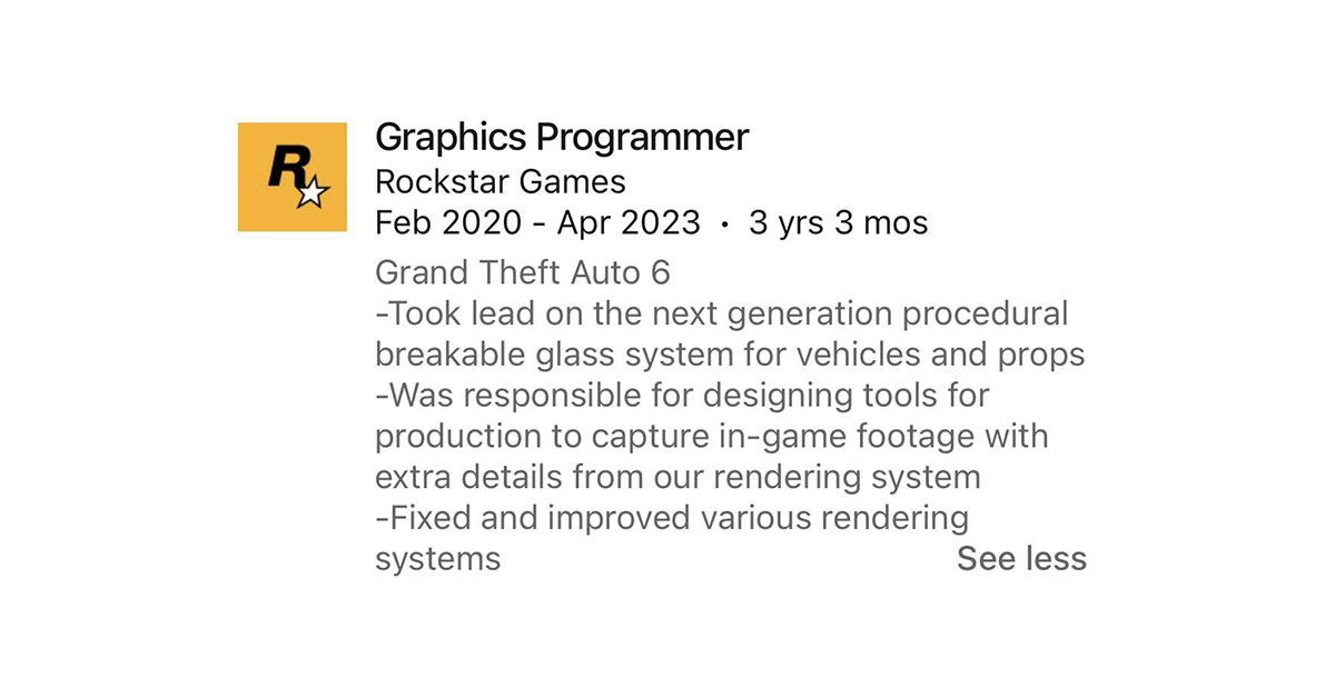 На этот раз источником информации стал LinkedIn-профиль бывшего графического программиста Rockstar Games, проработавшего в компании с февраля 2020 по апрель 2023 года.